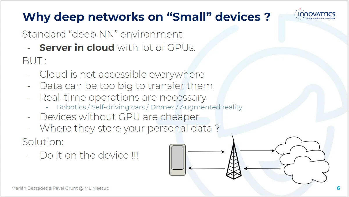 V stredu 23. mája ste mali možnosť zúčastniť sa odbornej prednášky o tom, či môžeme využívať hlboké neurónové siete (NN) na mobilných zariadeniach. Použitie hlbokých NN je zvyčajne spojené s výkonnými servermi v cloude s množstvom GPU kariet. Napriek tomu by sme chceli ich potenciál využívať na akomkoľvek zariadení, aj na štandardnom mobile. Kvôli veľkosti, spotrebe zdrojov a výkonu však stále nie je jednoduché používať ich mimo cloudu.