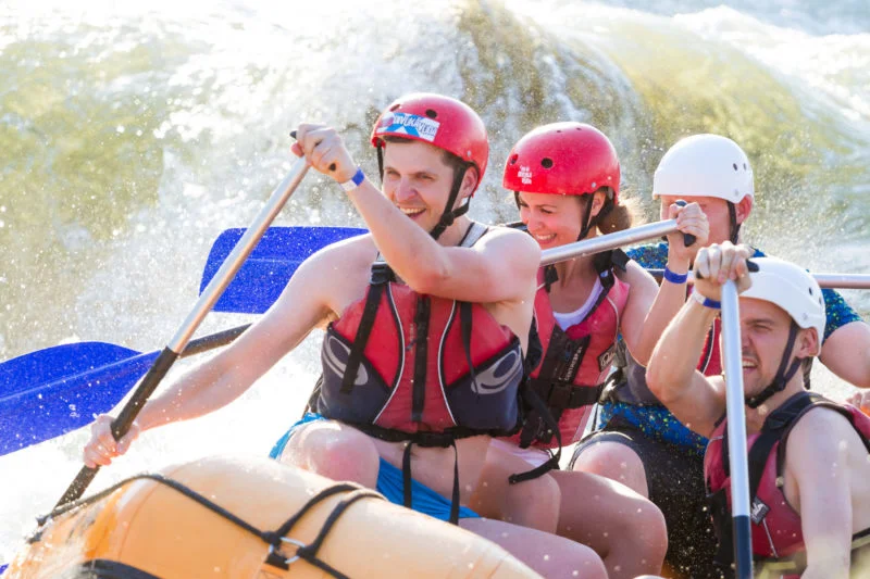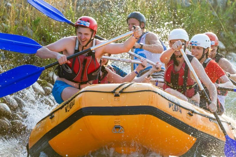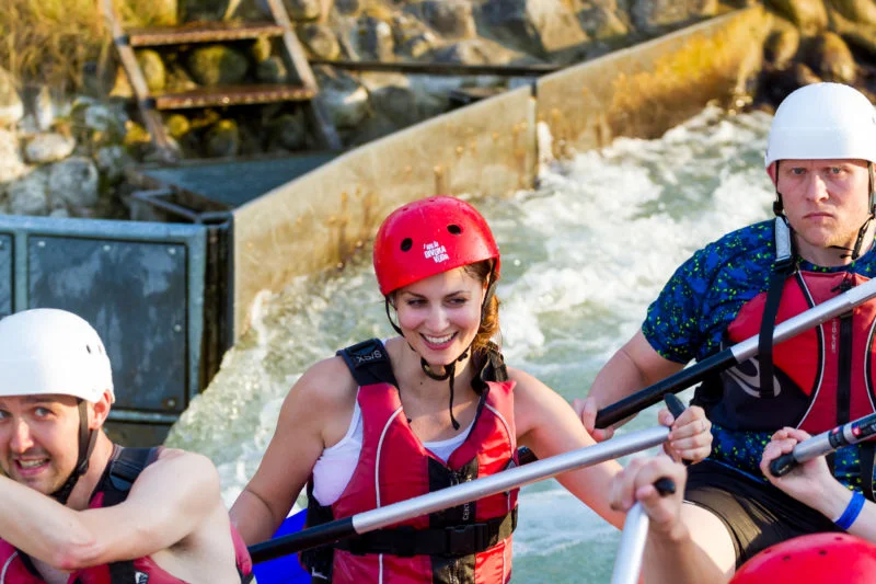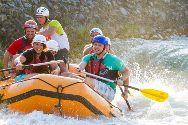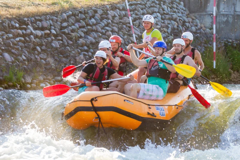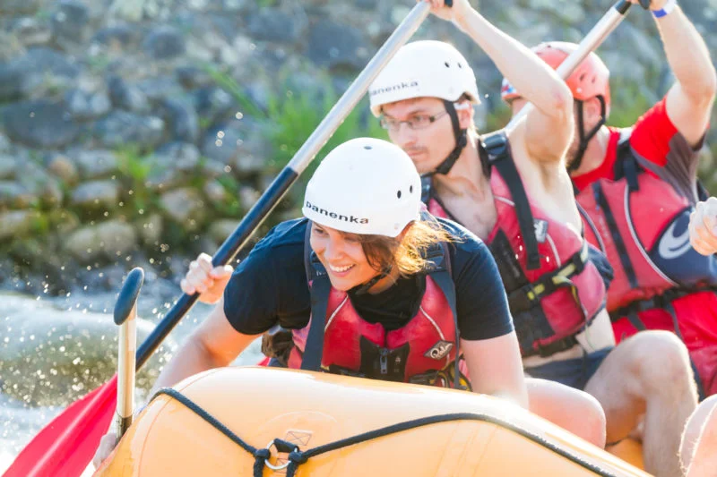 A teraz poriadne zaberieme! Kričí inštruktor sediaci na konci raftu v strede. Ani sa nenazdáme a rútime sa do rozbúrenej vody, medzi balvany kameňov, pádlami zaberáme dopredu, dozadu, otáčame sa proti prúdu a testujeme teplotu vody na vlastnej koži.